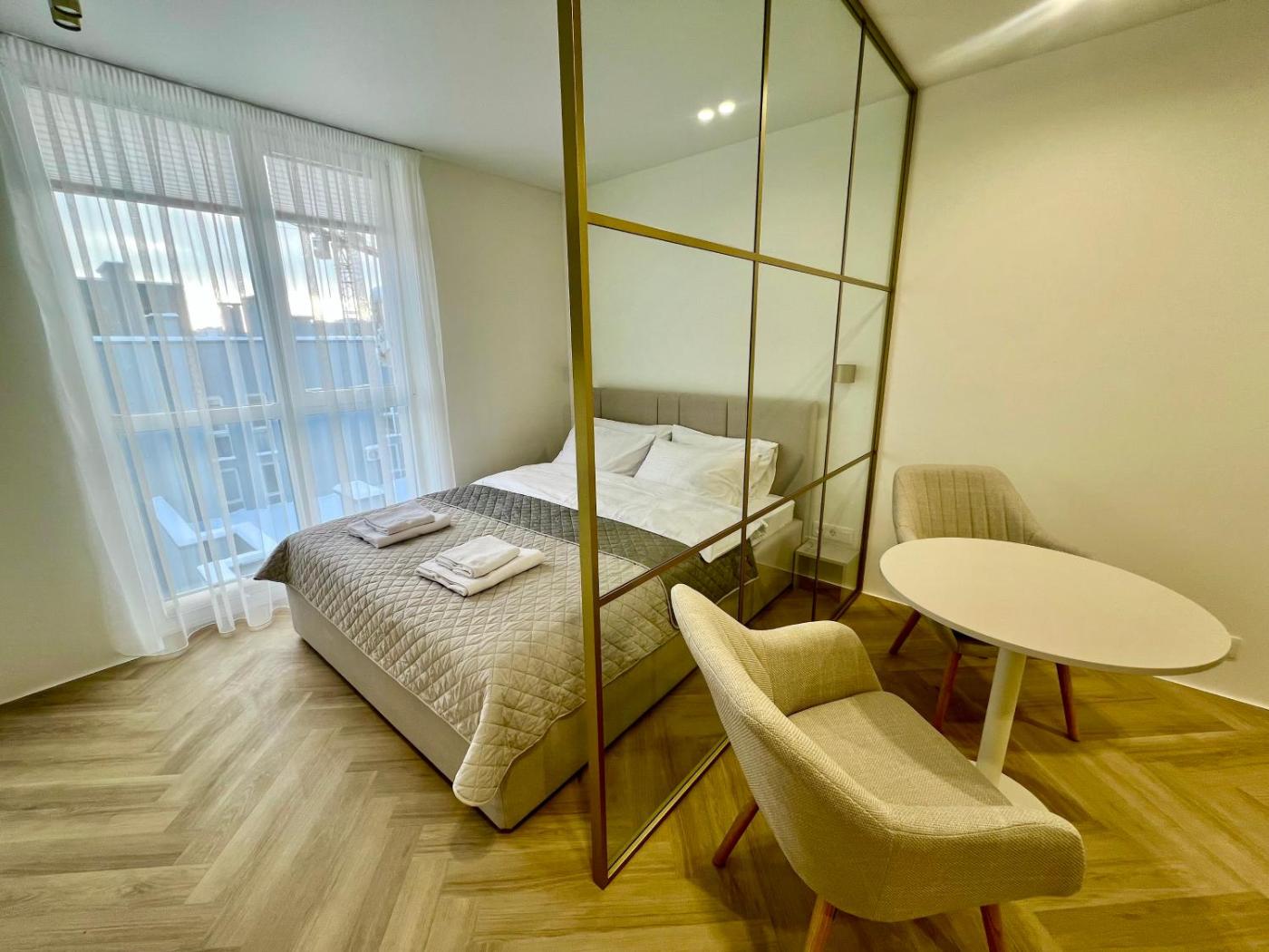 Apartment. The air-conditioned apartment has 1 bedroom and 1 bathroom with a shower and a hairdryer. Guests can make meals in the kitchenette that features a stovetop, a refrigerator, kitchenware and a microwave. The apartment features a dining area, a wardrobe, an electric kettle, a flat-screen TV, as well as city views. The unit has 1 bed.