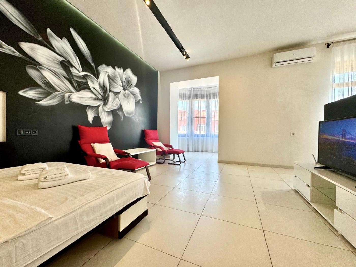 One-Bedroom Apartment. This spacious apartment features 1 bedroom, a kitchen and 1 bathroom with a bath and a shower. In the kitchen, guests will find a stovetop, a refrigerator, kitchenware and an oven. The air-conditioned apartment features a flat-screen TV with cable channels, a washing machine, soundproof walls, a tea and coffee maker as well as city views. The unit has 1 bed.